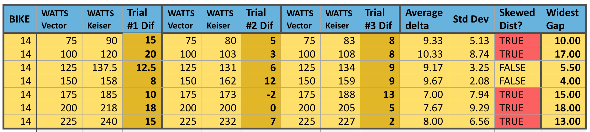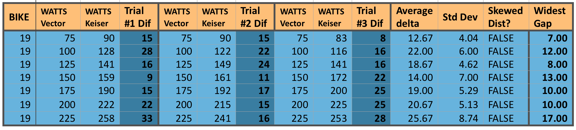 Our last bike does seem to show a glimmer of hope though. While this specific bike had some of the largest differences in actual to measure power differences (in the 15 to 25 watt range), at least it showed those big swings fairly consistently. Notice how small the Standard Deviation is compared to the average delta (simply means the difference) among all three trials. This thus demonstrates a more “normal” distribution and could indeed support a type of “Power Handicap”.